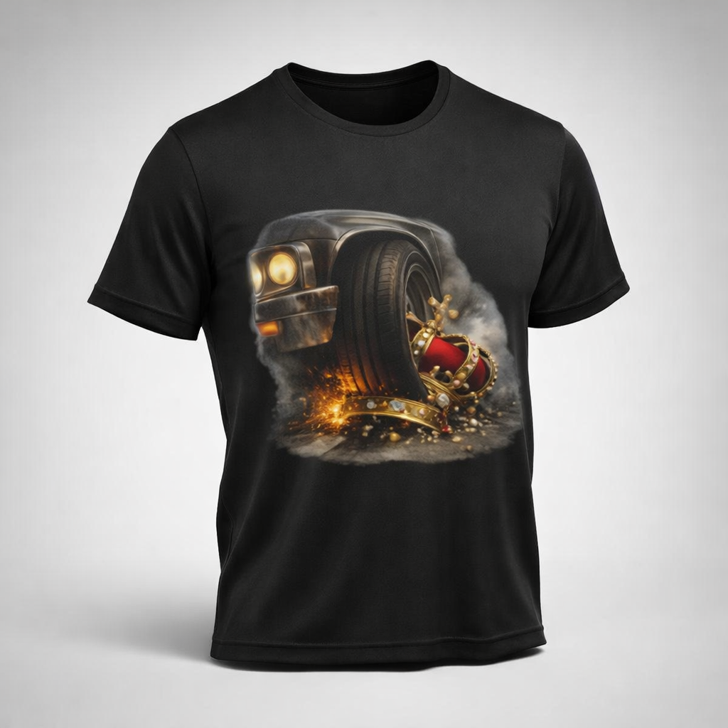 NO KING — Crown Under Tire represents the end of unchecked power, inherited authority, and manufactured dominance. A crown crushed beneath raw force reminds us that no one rules by default — respect is earned, not crowned.